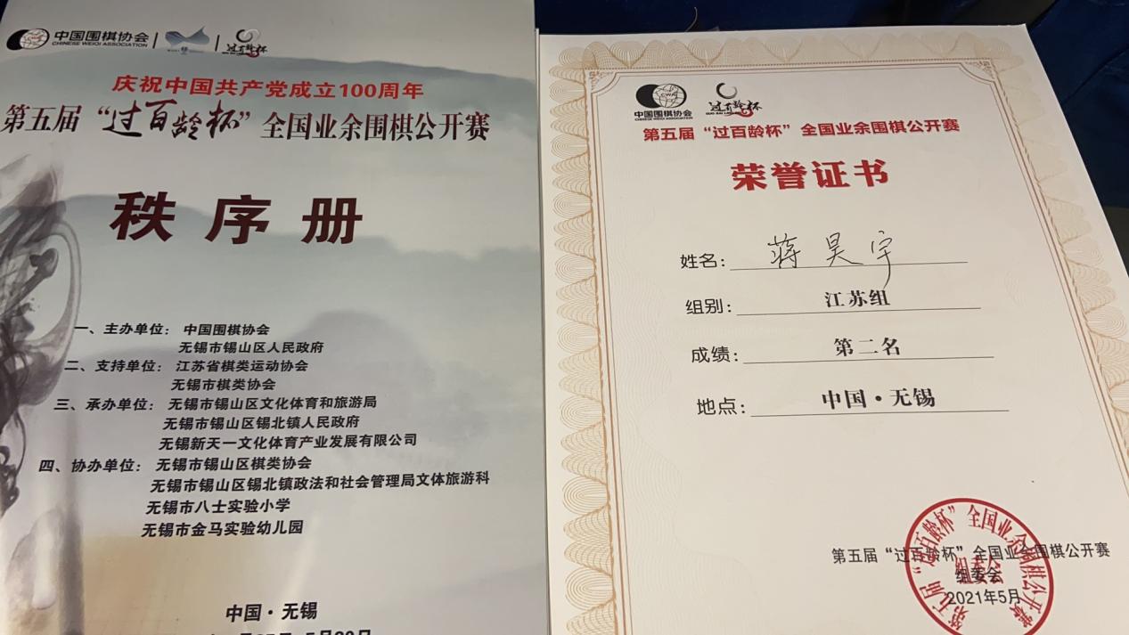 我院蒋昊宇5段获第五届“过百龄杯”江苏组亚军