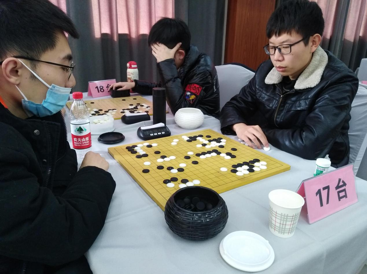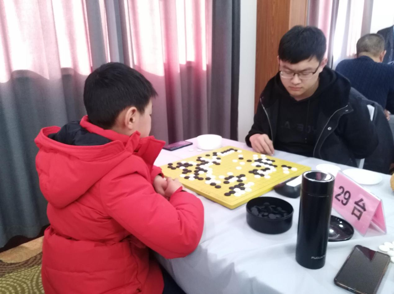这次迎春杯比赛,参赛选手近百人,多是苏北地区的围棋高手。浦江学院派出五名业余5段学生参加,他们是蒋昊宇、刘嘉昕、缪凌申、袁至诚、李沛霖。元旦当天的五轮比赛,蒋昊宇五战五胜,已显夺冠势头。第二天的主要对手,是苏北地区的围棋高手,盐城当地的童锐业余6段。晚上我和昊宇讲,明天如果拿下童锐老师,冠军非你莫属。从心理上说,童锐6段比你压力大,因为他担负着不能冠军旁落的责任。果不其然,转天开赛,感觉童锐老师表情有些凝重,棋下得也有些紧。不过,苏北强豪不是徒有其名,渐渐地,昊宇同学先捞后洗的策略遭到童锐老师的缠绕进攻。勉强活出两块孤棋,实空明显不足。此时,优势意识下,童锐老师下的有些保守。反观昊宇同学局势已弱,锐意侵绰,直接断下三颗黑子,导致中腹混战。结果,胜利女神眷顾了蒋昊宇同学。此时我已确信,最后一轮无人能挡昊宇夺冠之路。